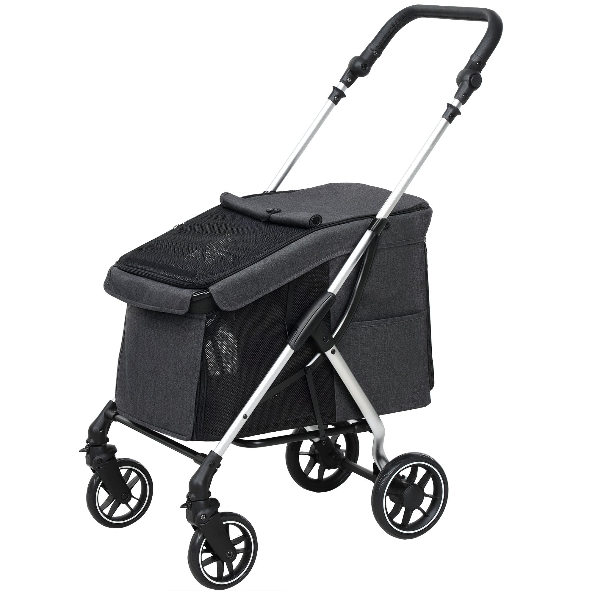 Hundeklapvogn, let og sammenklappelig transportvogn til små hunde, vaskbar hynde, netvindue, grå