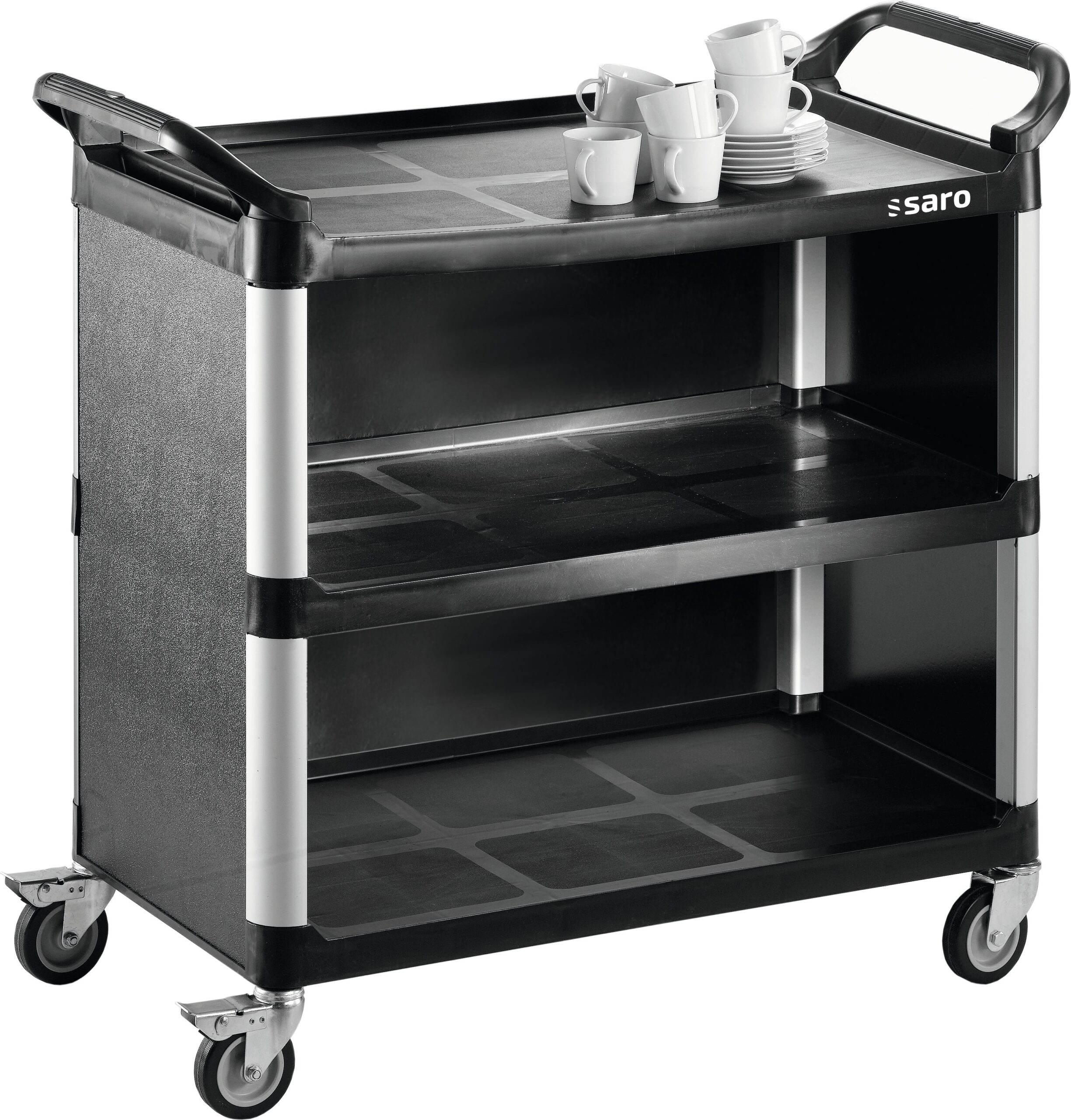 Materiale: plast, letmetal⢠3 hylder⢠nyttelast max. 150 kg⢠4 hjul (2 med bremser)⢠Vægt: 20,1 kg⢠Mål: B 1020mm x T 500mm x H 960mm